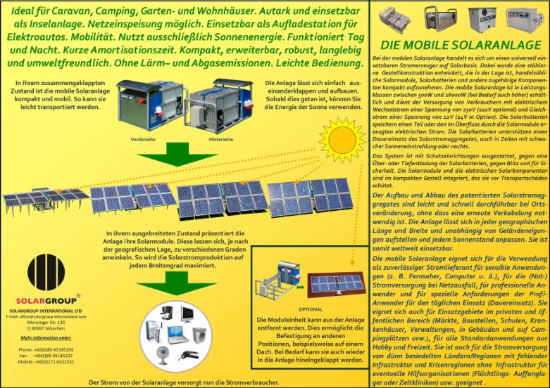 Die mobilen Solaranlagen werden von SOLARGROUP INTERNATIONAL LTD entwickelt, produziert und vermarktet.